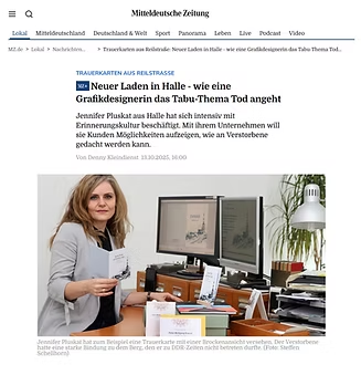 Ich freue mich über die Vorstellung von Alpha et O – Raum für Erinnerungsstücke und Lebensgeschichten im Regionalteil der Mitteldeutschen Zeitung. Online erschien der →Artikel „Neuer Laden in Halle – wie eine Grafikdesignerin das Tabu-Thema Tod angeht“ am 13.10.2025.